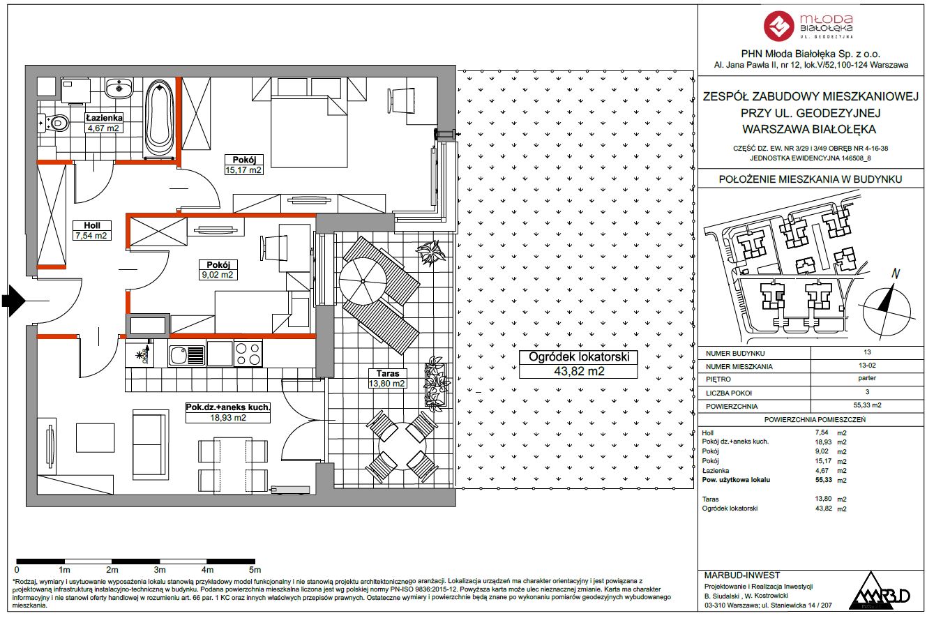 Prezentowany lokal to bardzo przestronne i ustawne 3 pokojowe mieszkanie z aneksem kuchennym o powierzchni całkowitej 55,76 mkw. z dużym tarasem o powierzchni 13,80 mkw. oraz ogródkiem o powierzchni 43,82 mkw. (numer mieszkania 13-02). Zakup bezpośrednio od dewelopera – Grupy Kapitałowej Polskiego Holdingu Nieruchomości.