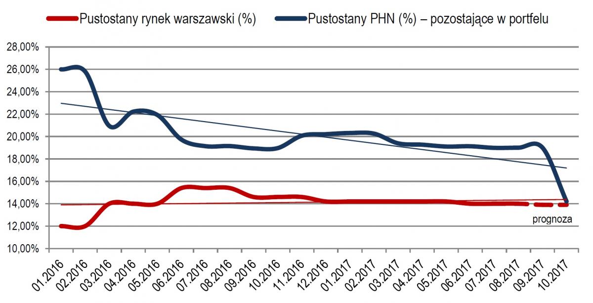 Podjęliśmy bardzo ciężką pracę i w ciągu niespełna 18 miesięcy obniżyliśmy wskaźnik powierzchni niewynajętej PHN o połowę, do wartości 14,2% procent. Wypełniliśmy w październiku założenia naszej strategii na rok 2017 w tej kwestii, (wyznaczały osiągnięcie poziomu 15,3%) oraz nieustannie pracujemy nad dalszym obniżaniem tego wskaźnika, aby w 2023 roku wyniósł 6,9%. - powiedział Maciej Jankiewicz, Prezes Zarządu Polskiego Holdingu Nieruchomości S.A.