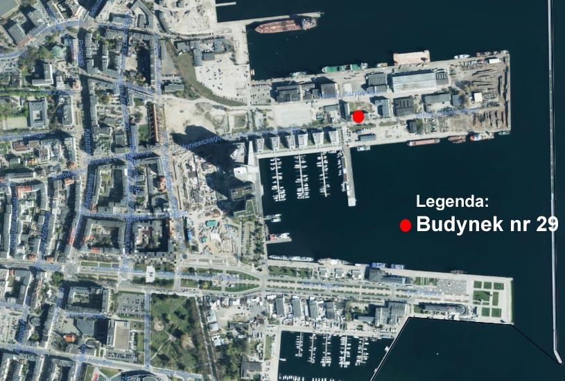 Budynek biurowy, o numerze administracyjnym 29 (dokładne usytuowanie budynku oznaczone na załączonej mapce), 4-kondygnacyjny, zlokalizowany w rewitalizowanej części śródmieścia Gdyni, na postindustrialnym terenie Mola Rybackiego, blisko nadmorskich terenów rekreacyjnych i licznych obiektów handlowo-usługowych.