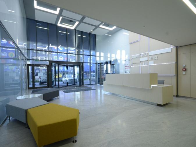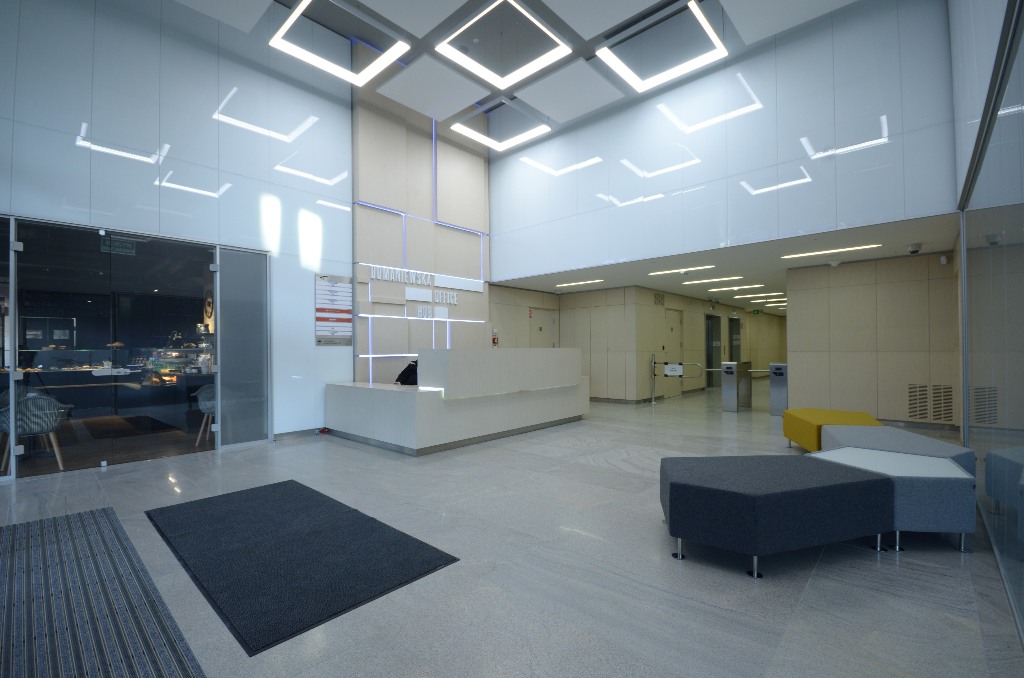 Domaniewska Office HUB składa się z dwóch połączonych, siedmiokondygnacyjnych budynków: A i B. Sercem każdego z nich jest przestronny, efektownie zaaranżowany hol, którego centralnym punktem jest nowoczesna lada recepcyjna. Hol komunikuje użytkowników z pozostałymi powierzchniami budynku – poprzez zespoły windowe – z piętrami biurowymi i dwupoziomowym parkingiem podziemnym (wysoki współczynnik miejsc garażowych).