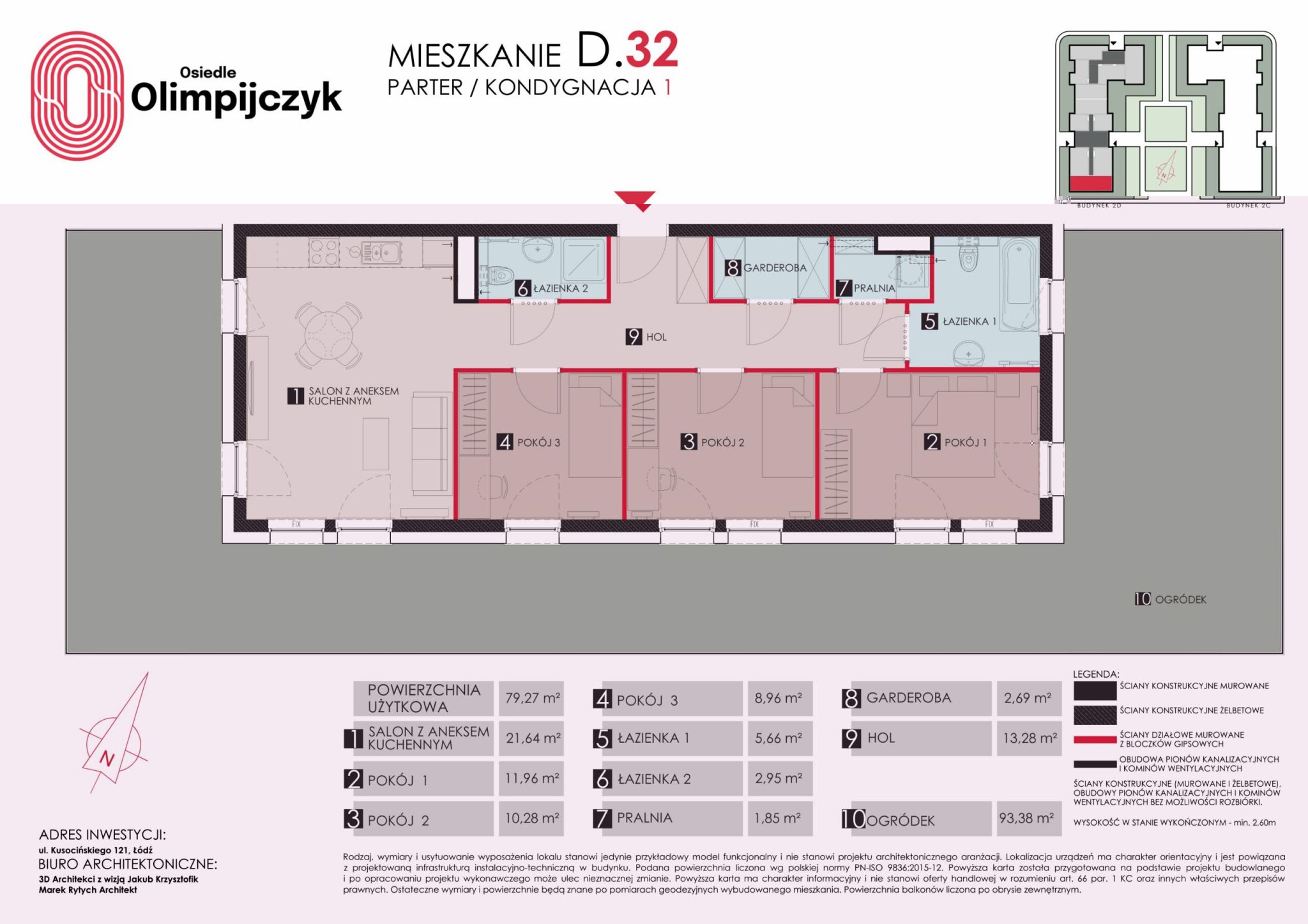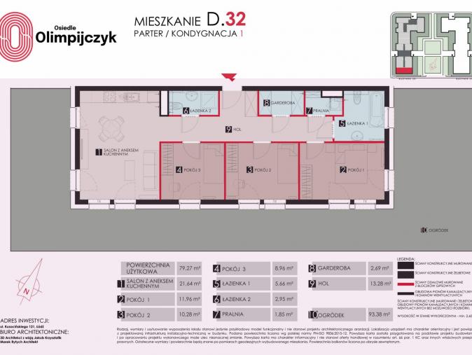 Prezentowany lokal to wyjątkowo funkcjonalne, przestronne i ustawne mieszkanie czteropokojowe o powierzchni łącznej 79,32 mkw. usytuowane na parterze budynku pięciopiętrowego (mieszkanie nr D32). Mieszkanie posiada dwie łazienki oraz garderobę oraz bardzo przestronny ogródek o powierzchni ponad 93 mkw. Ekspozycja mieszkania na trzy strony świata.